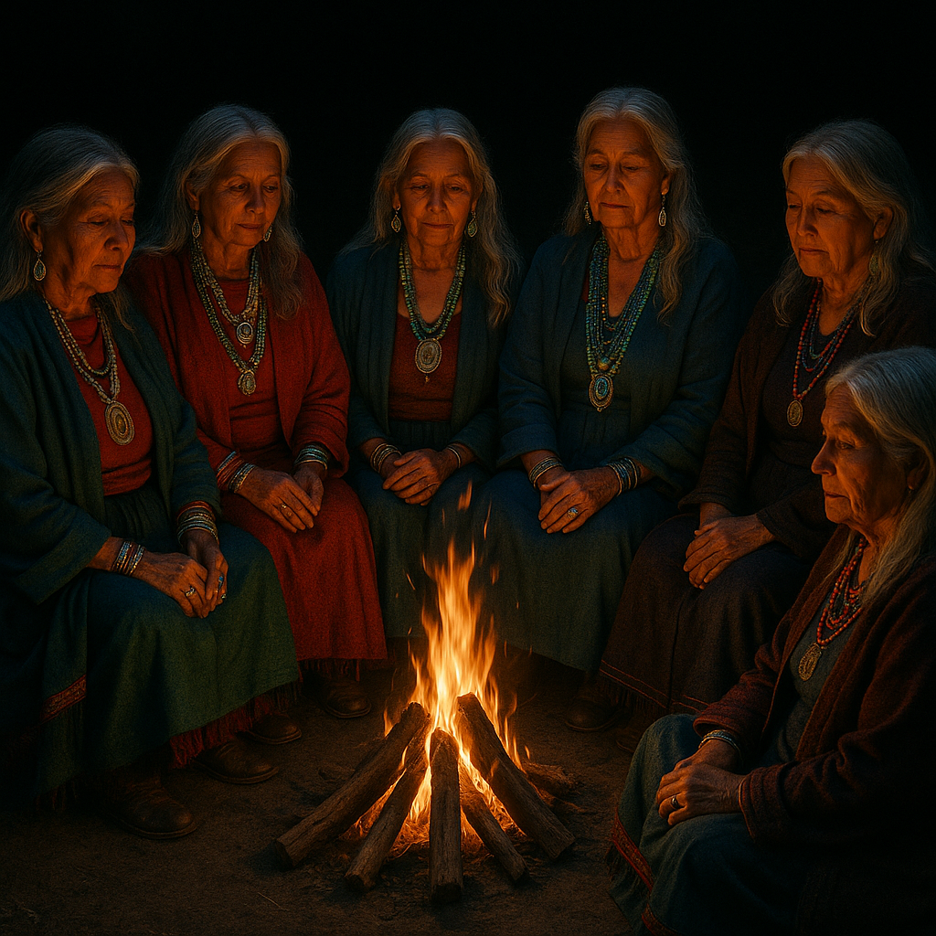 De cirkels vinden plaats in een tipi of yurt, omringd door natuur en vuur.